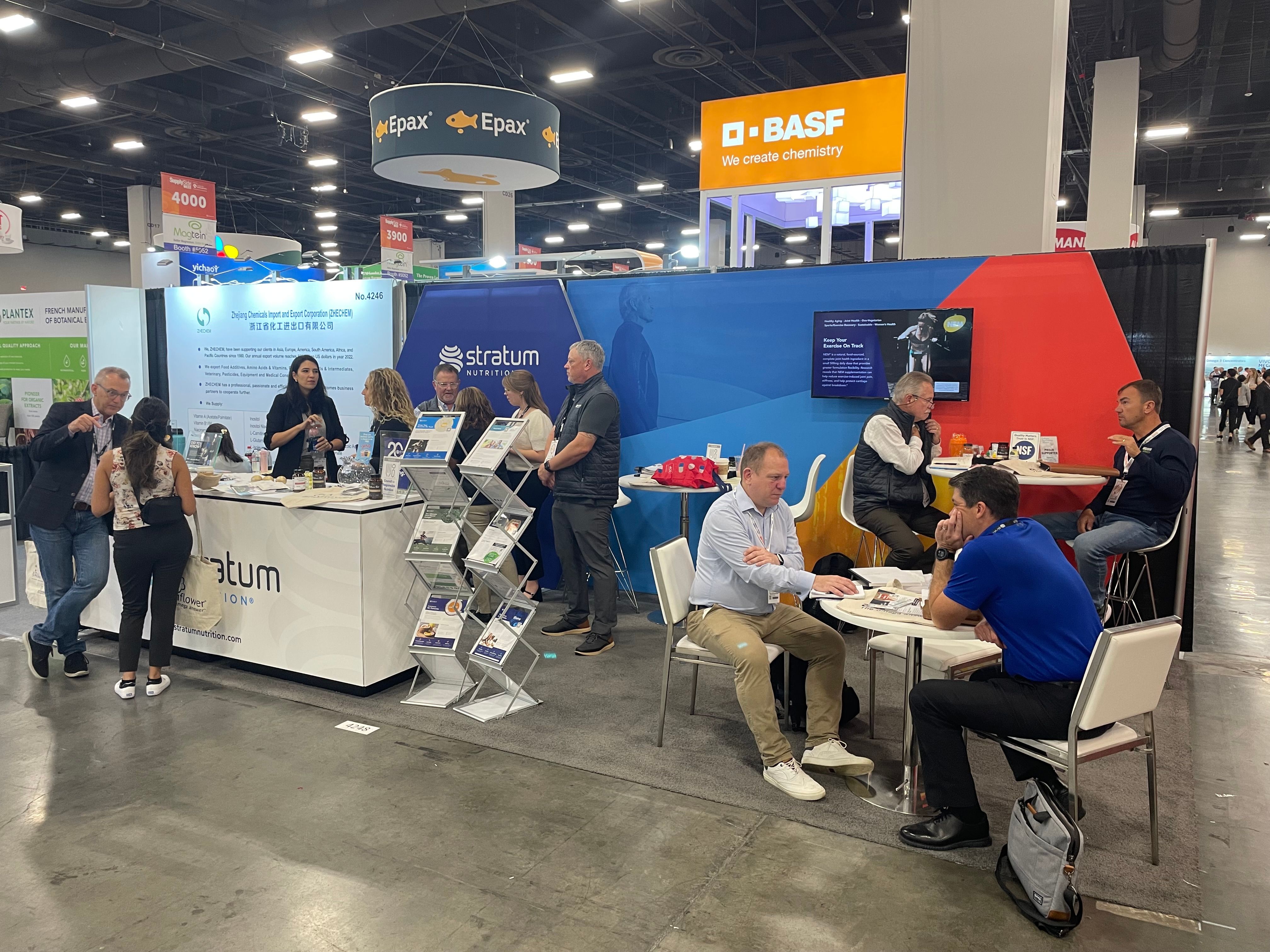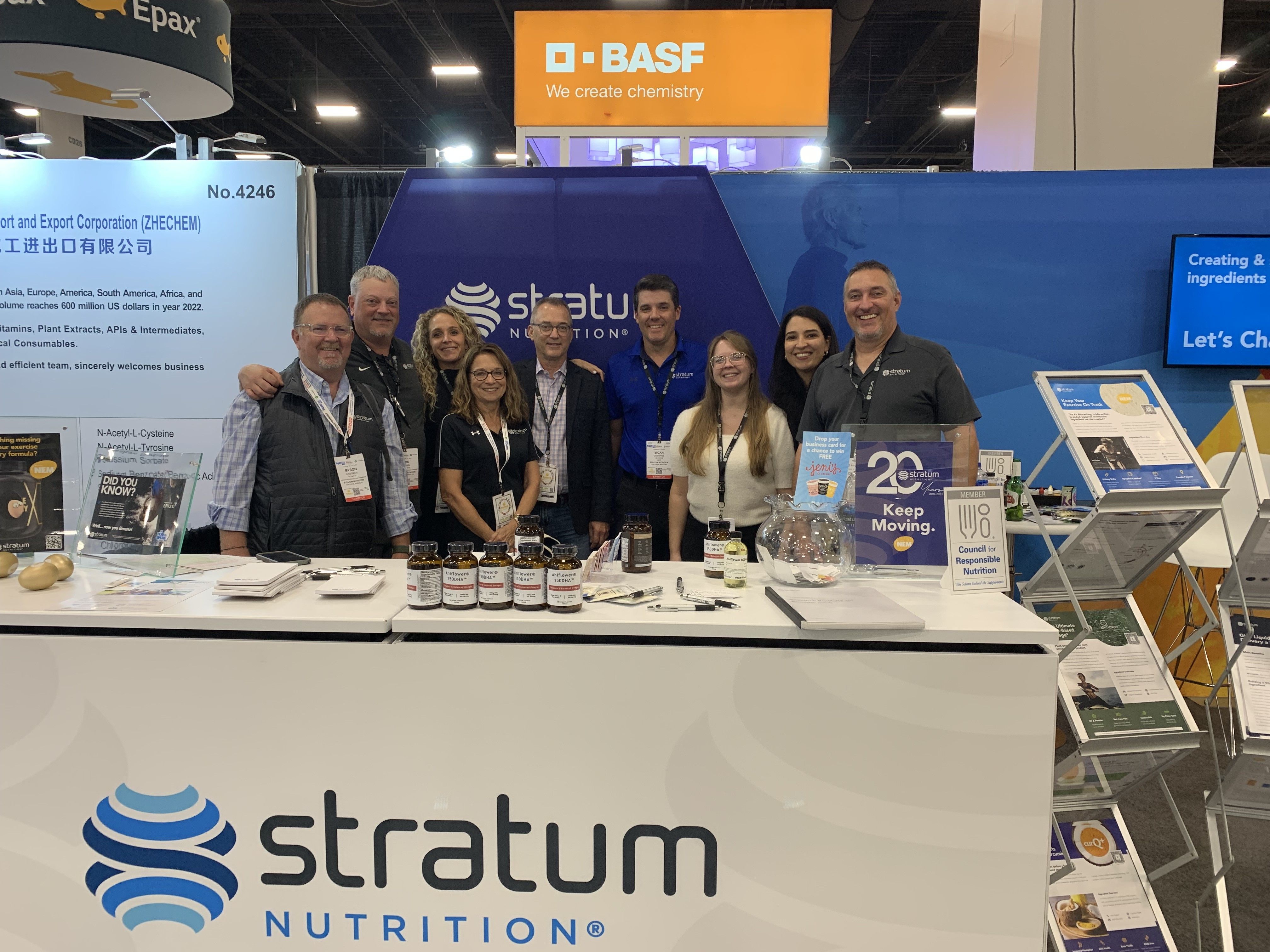 The Stratum Nutrition® booth was stocked with 20th Anniversary cookies and tasty samples for attendees and potential customers to try. We had on hand Ahiflower® + DHA gummies that were lemon and watermelon flavored which were also featured at the Tasting Bar, a prebiotic-postbiotic gummy made by KorNutra using Bimuno® and LBiome™ with a tasty berry flavor, and Clasado & Probi’s synbiotic sachets.