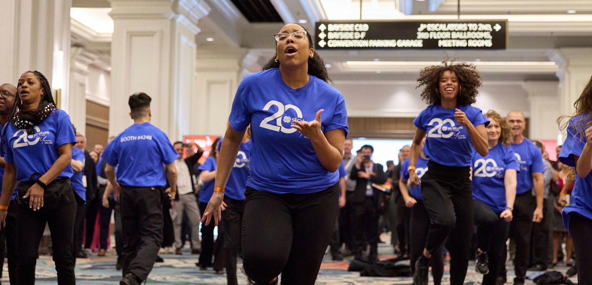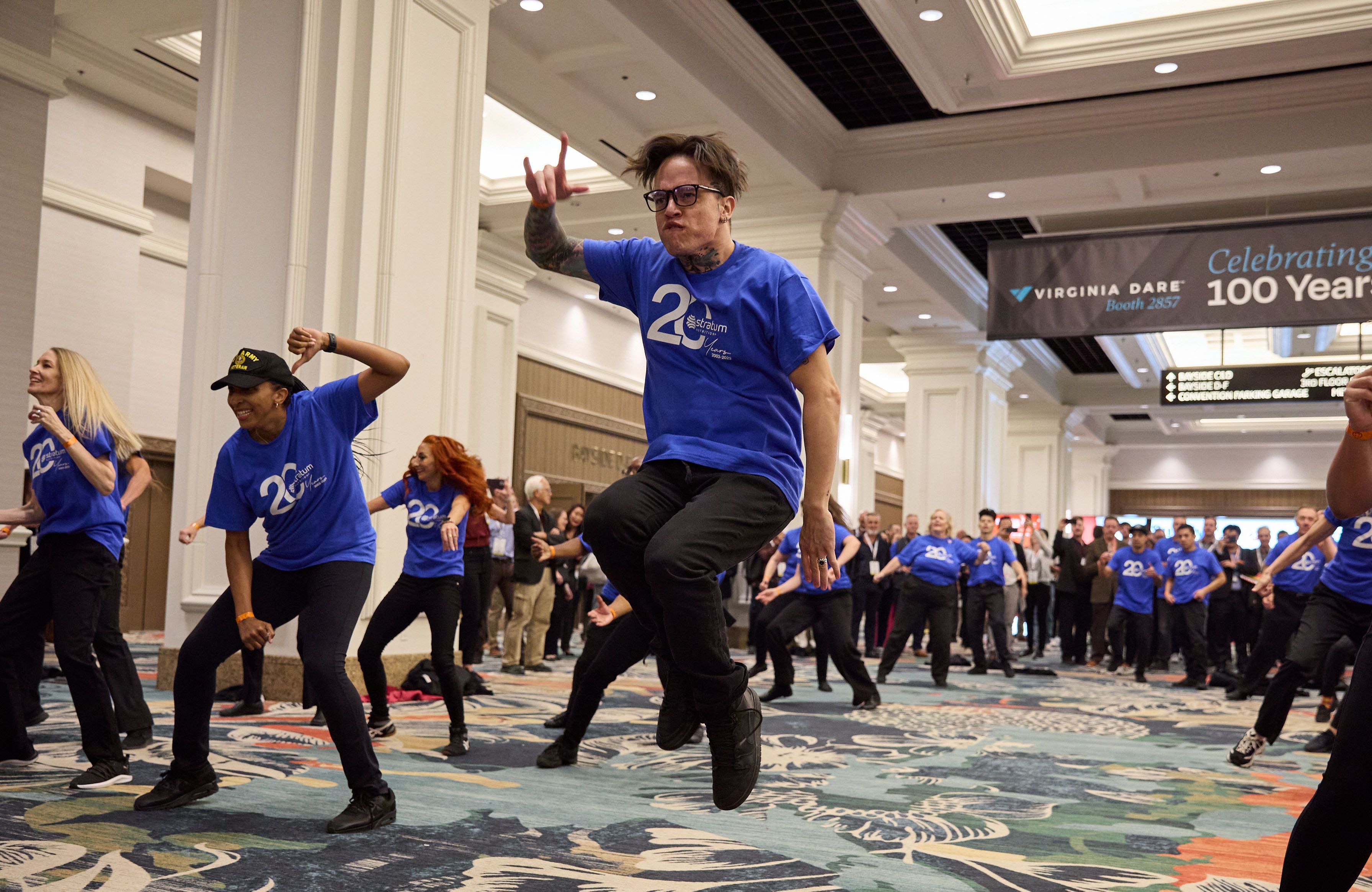 Stratum Nutrition® had an exciting time celebrating our 20th Anniversary with a flash mob! Our marketing team wanted to do something different to stand out and celebrate 20 years, so our Marketing Manager, David Hoover, came up with the fun idea of a flash mob. While everyone was waiting to enter the showroom floor on the first day, “Let’s Get It Started” by the Black-Eyed Peas began to play as a few people stepped up and started dancing. As the song went on, more and more dancers gradually joined the group until they were all together, busting moves. At the height of the song, they all took their jackets off to reveal t-shirts with our 20th Anniversary logo on them. When people saw our name, they cheered. To be in the room while it happened was thrilling. The dancers did a fantastic job, and we couldn’t be happier with how it turned out! We want to thank everyone again who came to celebrate with us, it was something to be remembered.