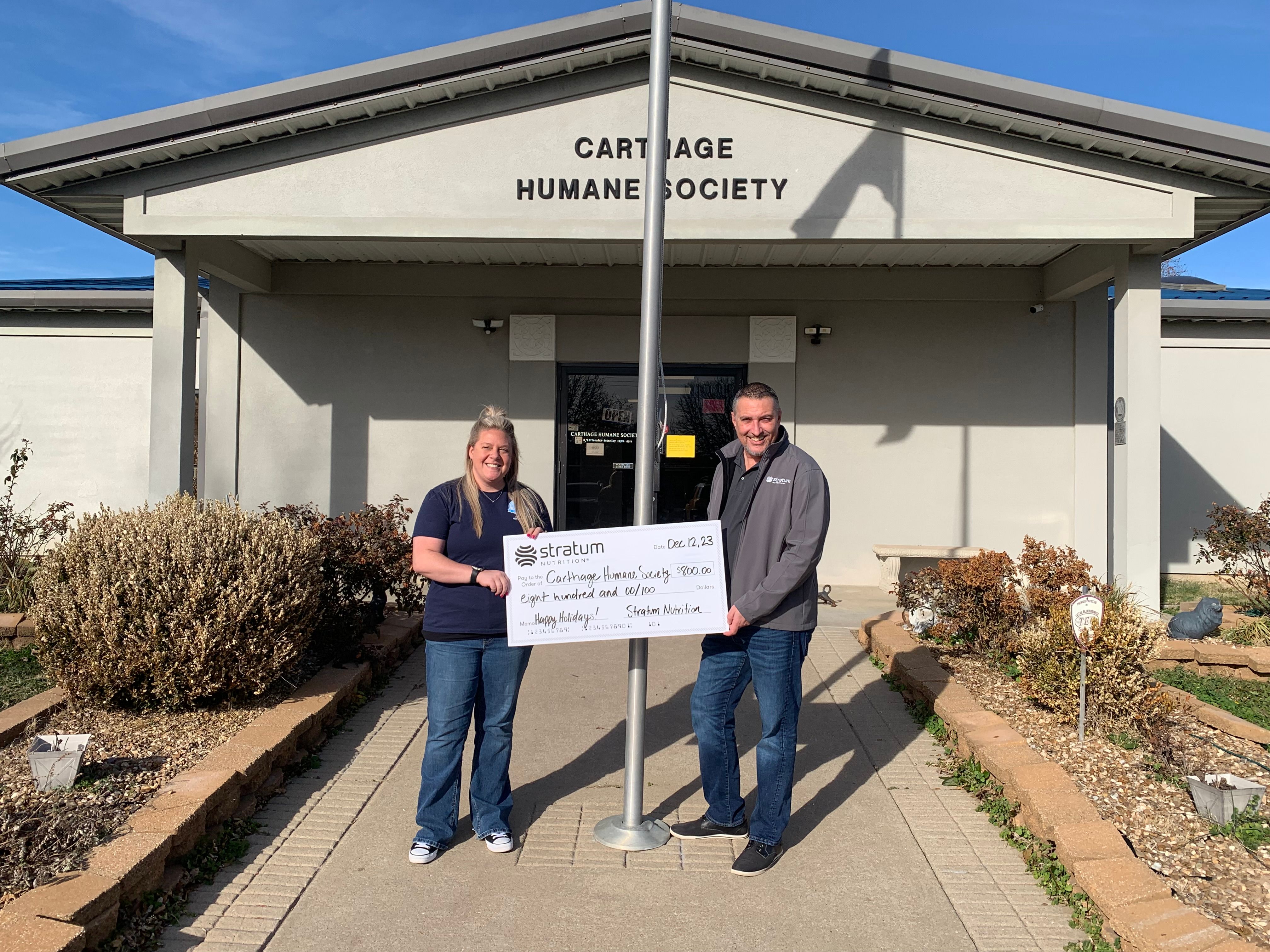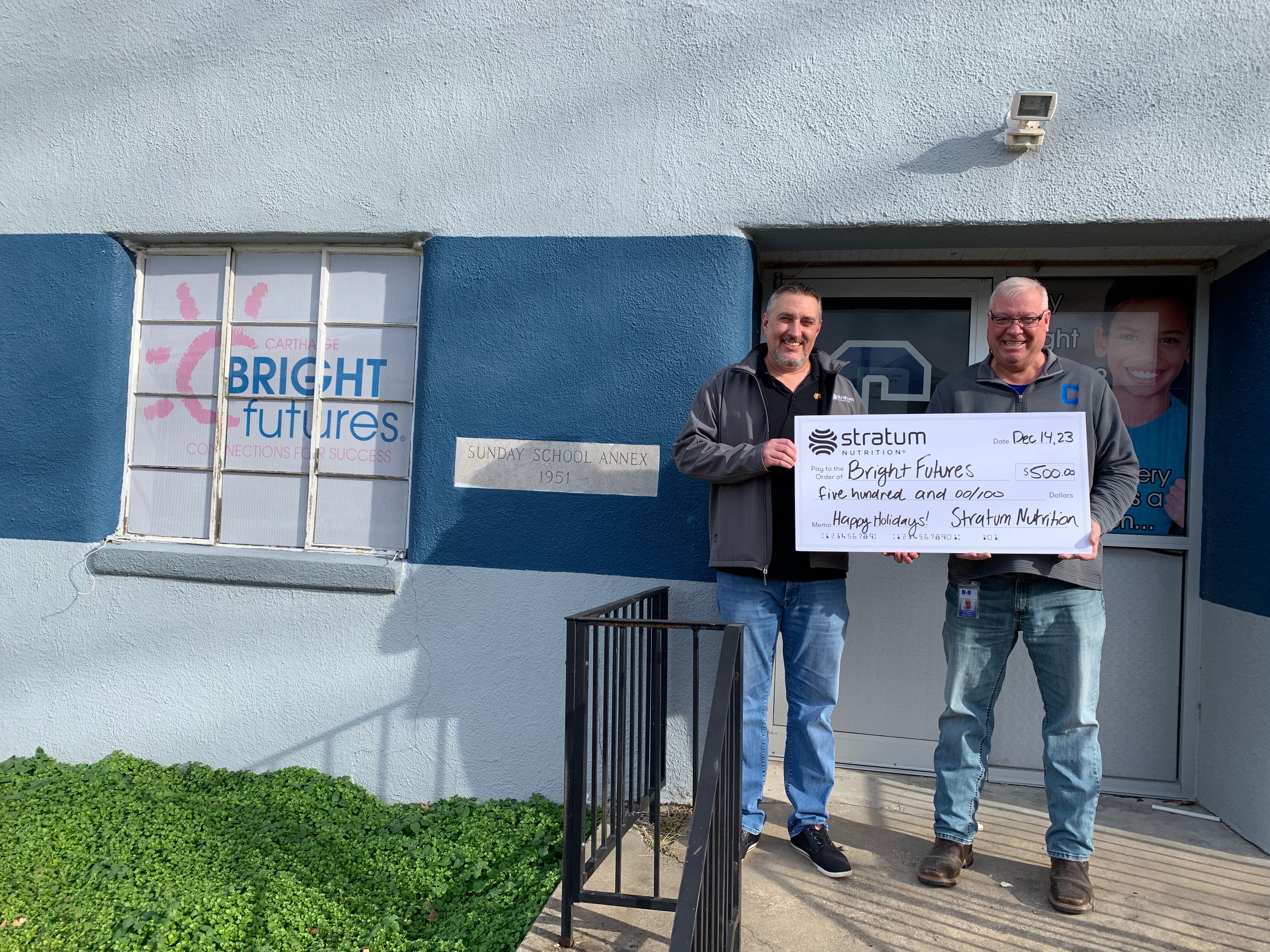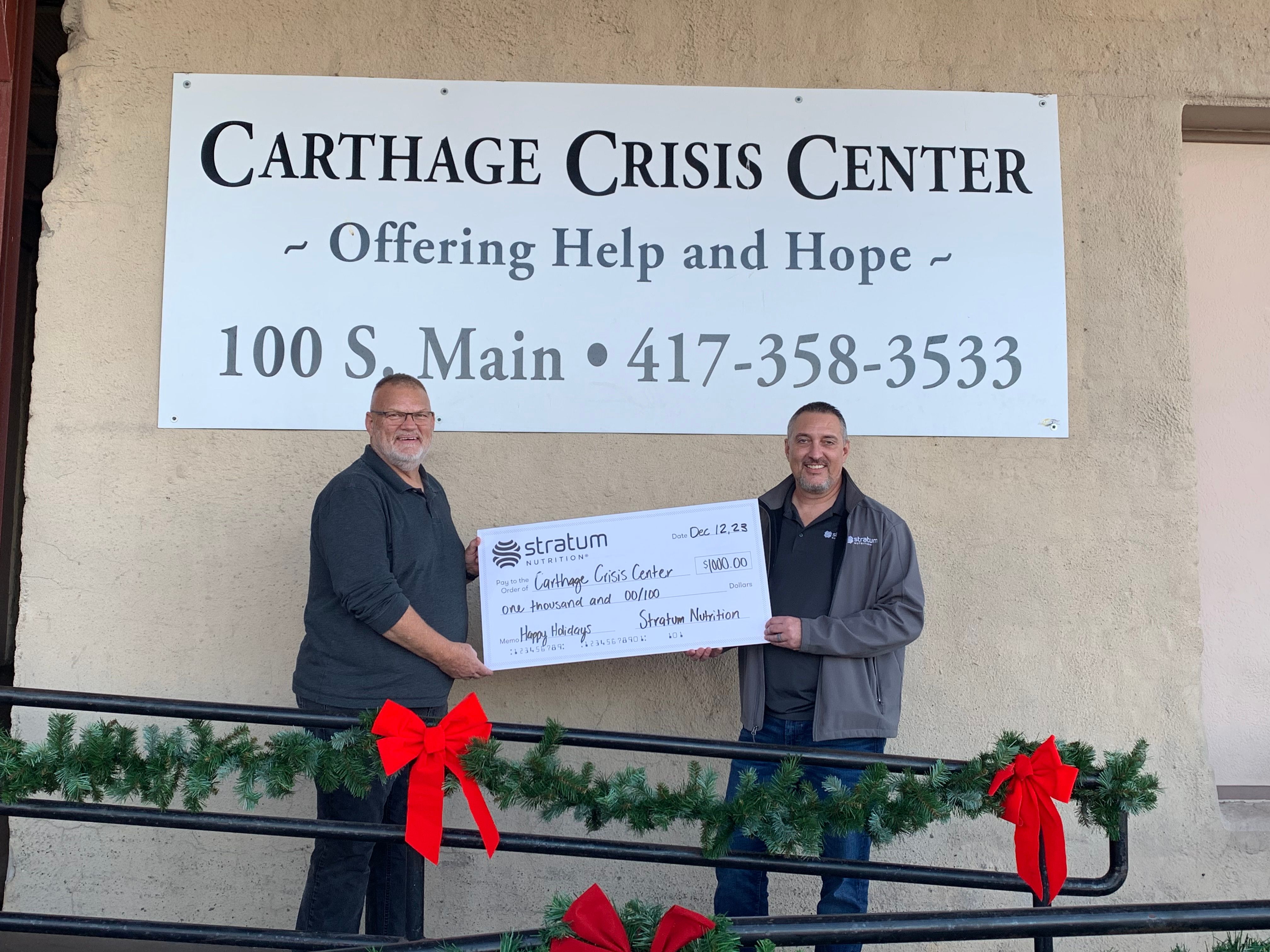 David Hoover, Marketing Manager at Stratum Nutrition, says, “One of Stratum's core values is caring for co-workers, customers, and the community. The Carthage Crisis Center, Carthage Humane Society, and Bright Futures Carthage are exceptional examples of what "caring" is all about. We're blessed to be able to support these institutions that contribute to the betterment of Carthage and are integral to enhancing the community we live in.”